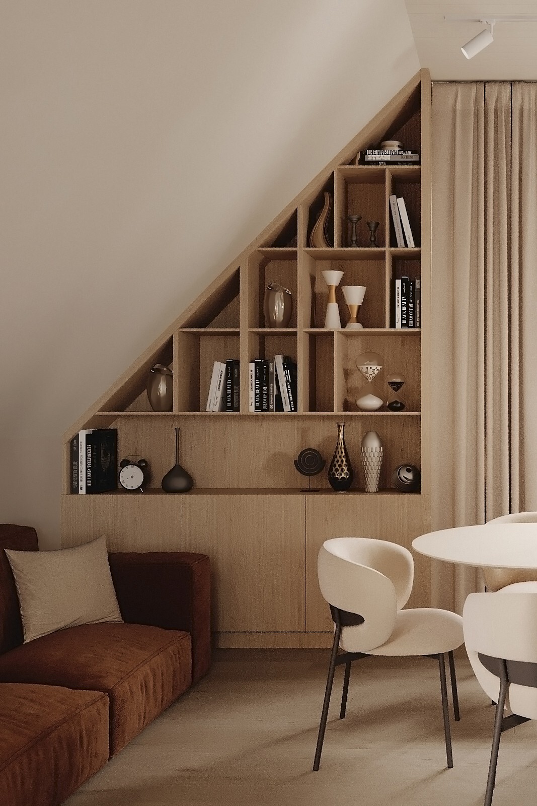 Совет: расположите предметы асимметрично для динамики. Если стена пустая, полки помогут визуально разделить пространство.